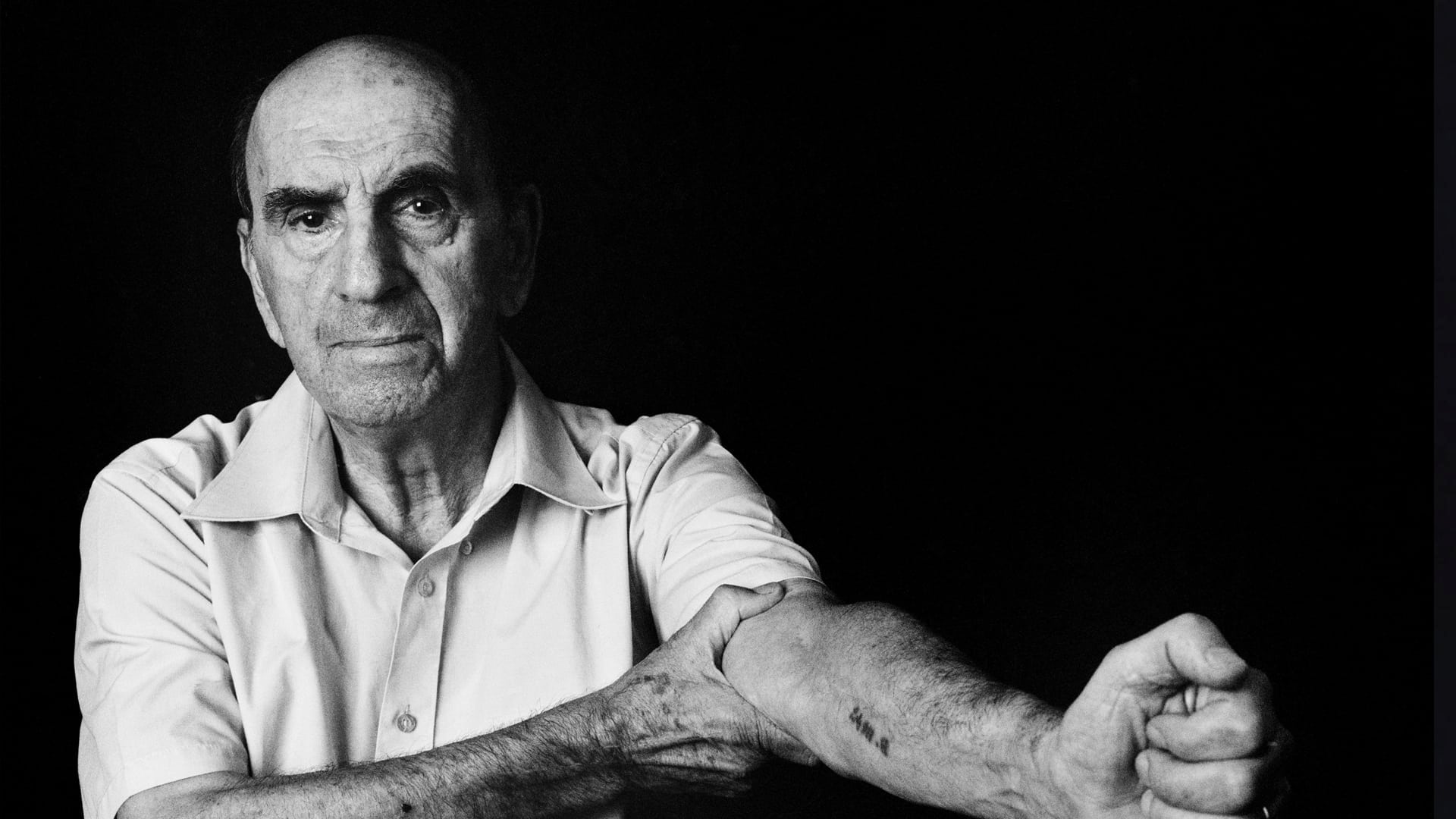 Affiche : Originaire de Grèce, Maurice Aelion, 84 ans, tatoué à l’âge de 20 ans à Auschwitz. La photographie a été prise le 8 août 2009 à Tel Aviv, Israël.